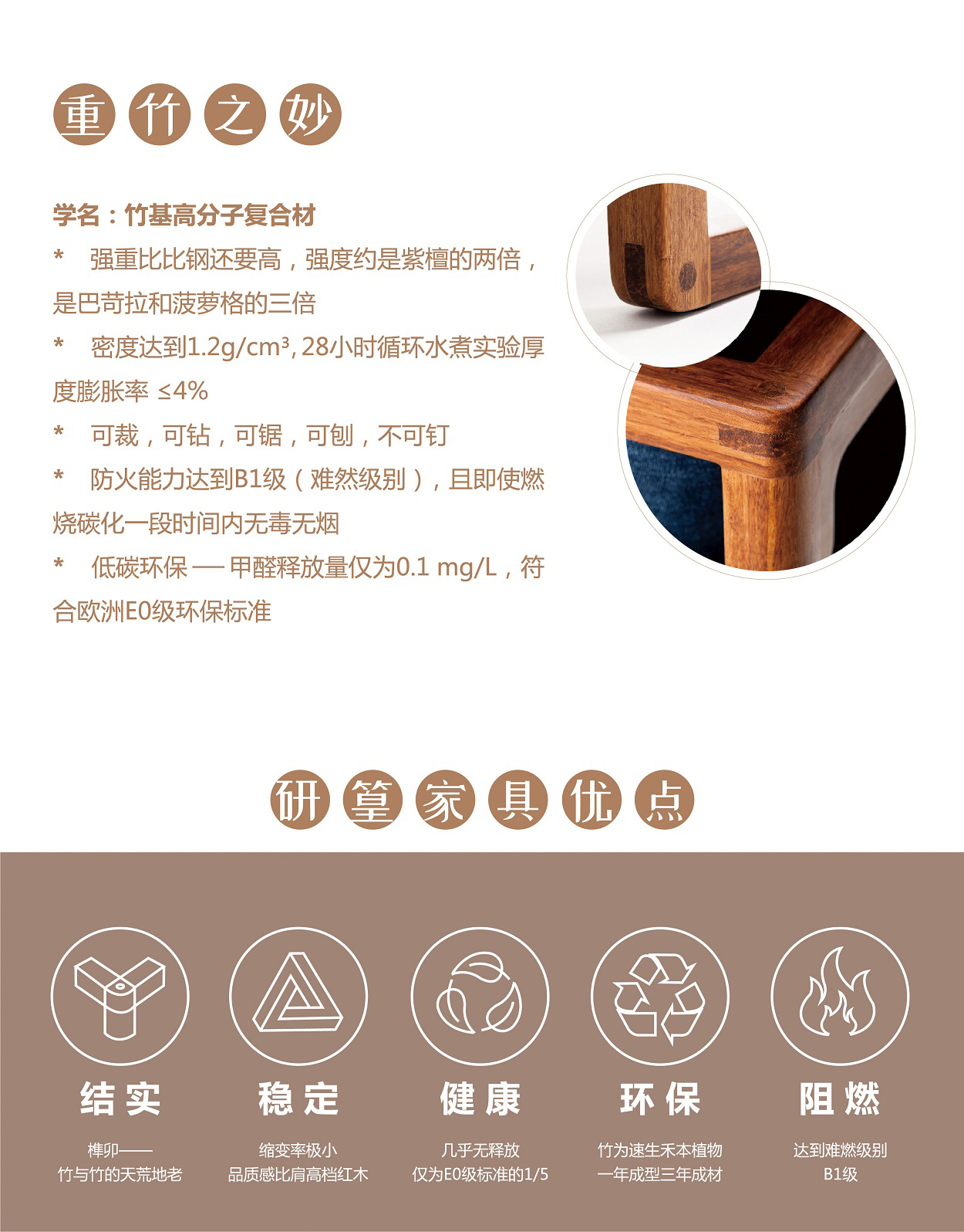 主体:竹基高分子复合材;自然原竹,高温碳化杀菌除虫竹片。